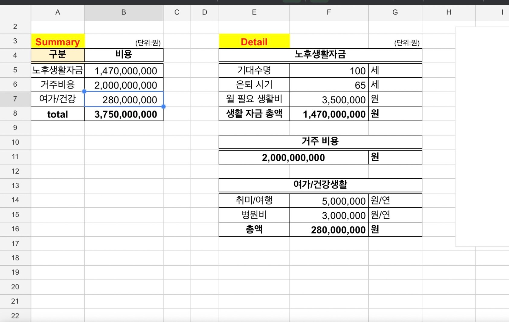 필요한 노후 자금 합계 ▶ 총 37억 5천 만원