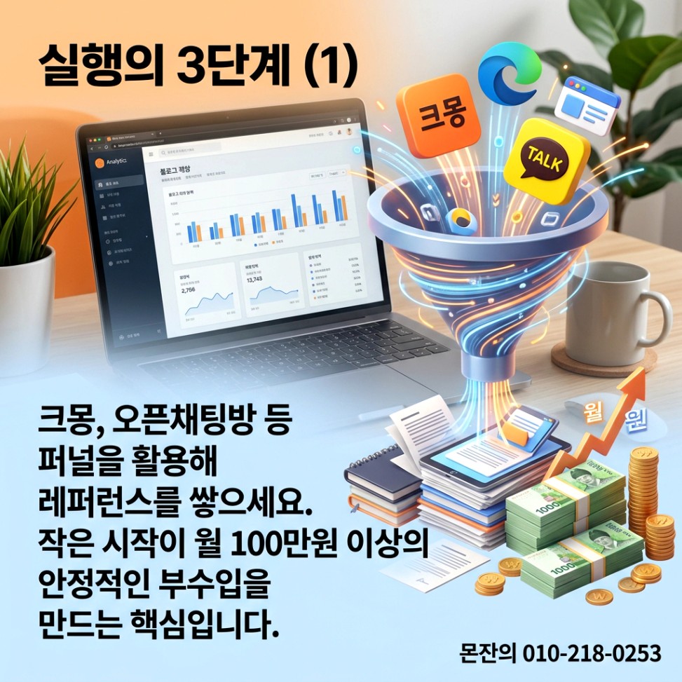 시작이 반입니다. 크몽, 블로그 챌린지, 카카오톡 오픈채팅방(대행/실행사), 블로그 대대행 단톡방 등 내가 활동할 수 있는 모든 퍼널에 발을 들이십시오. 처음에는 건당 1만 원, 2만 원의 소액으로 시작해도 좋습니다. 중요한 것은 돈보다 ‘레퍼런스(실적)’를 쌓는 것입니다.