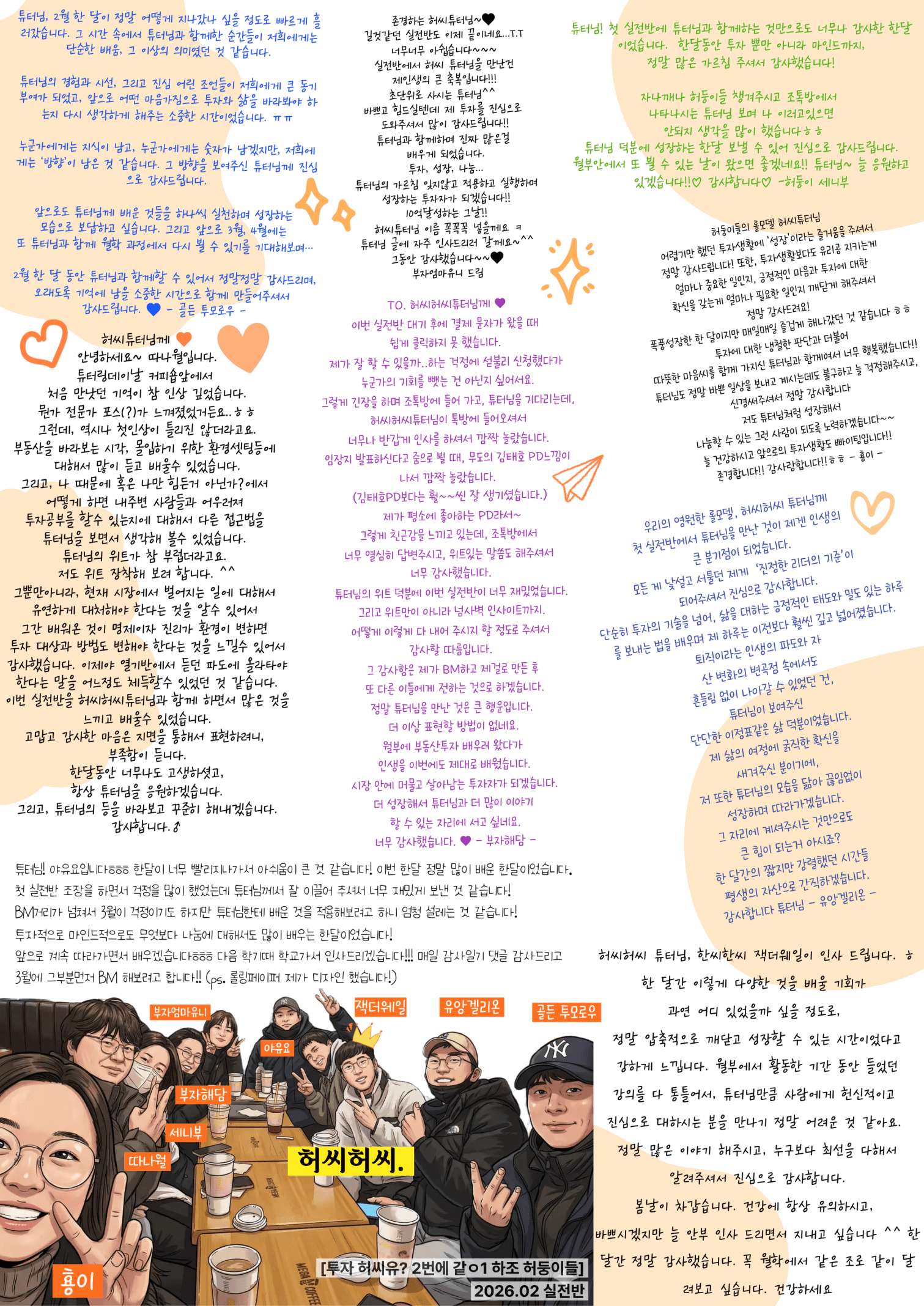 따나월님~~~ 편지 감동입니다💕 실전반에 와서 튜터님과 허둥이들 만날 수 있었던게 저의 큰 복이었습니다🥹🥹🥹 영원한 이별은 아니니 투자생활하면서 꼭 다시 봬요!!! 유리공과 투자생활, 직장까지 완벽하게 해내고 계신 따나월님께 많이 배우고 갑니다😊😊 앞으로도 파이팅입니다!!!!!