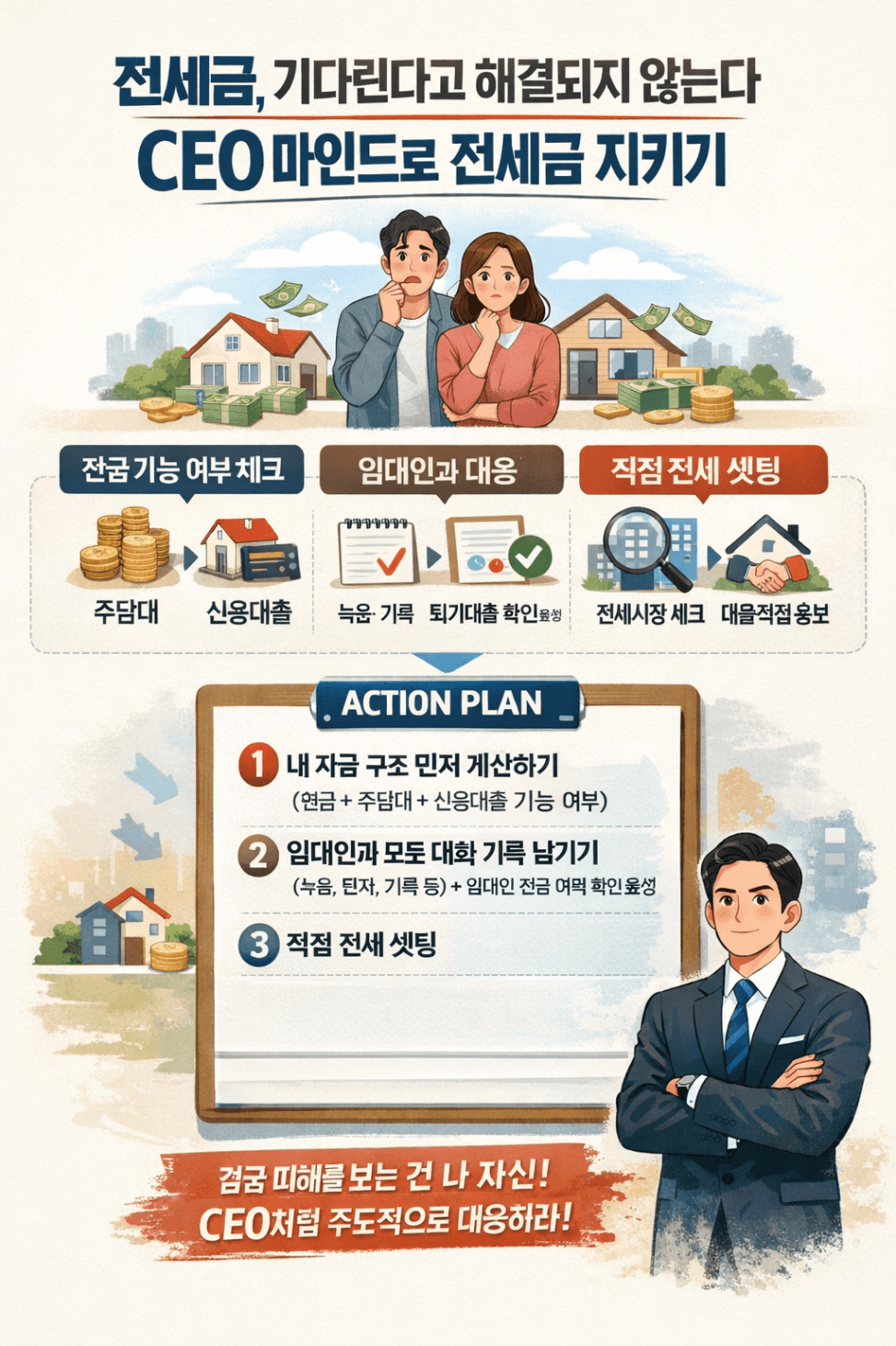 결국 피해를 보는 것은 나 자신입니다. 상황을 탓하기보다 내가 할 수 있는 범위 안에서 가장 적극적으로 움직이는 사람이 결국 전세금을 지켜냅니다.