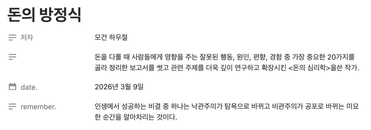 가장 인상 깊었던 점은 시간의 주도권에 대한 이야기였다. 비싼 물건을 사는 것보다 내가 원하는 사람과, 원하는 때에, 원하는 만큼 시간을 보낼 수 있는 자치권을 사는 것이 세상에서 가장 수익률 높은 투자라는 말에 깊이 공감했는데, 결국 우리가 저축하는 한 푼 한 푼은 단순히 미래의 물건을 사는 돈이 아니라 내 삶을 내 뜻대로 꾸려갈 수 있는 자유를 미리 구매하는 과정이었던 셈이었다.