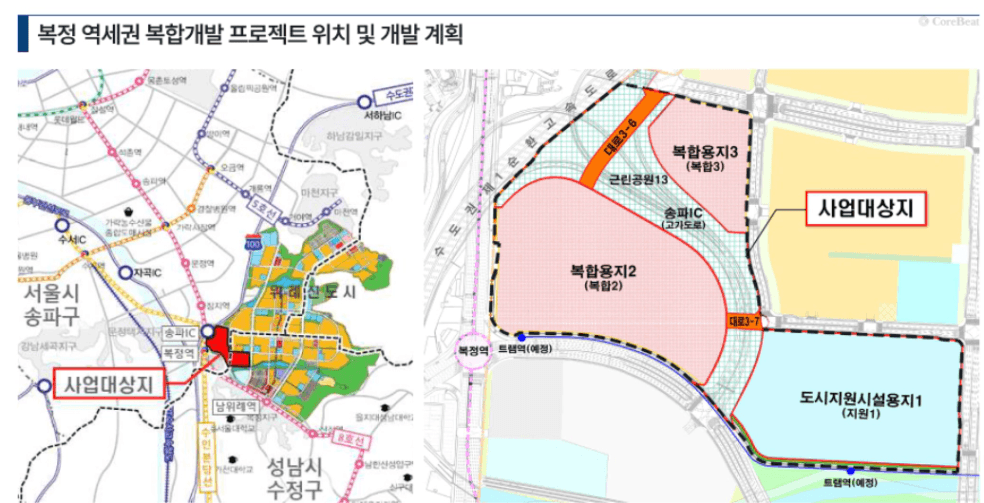 이 사업은 복정역 북측 부지에 주거, 업무, 상업 시설을 짓는 초대형 프로젝트입니다.