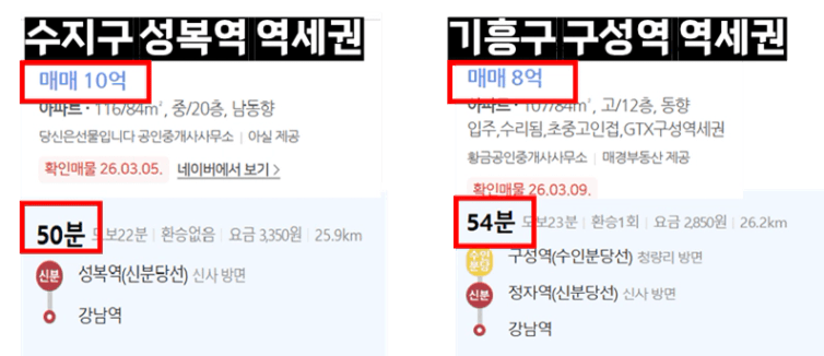 강남으로부터의 거리도, 출퇴근 시간도 비슷한 두 단지