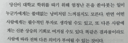 반면 어떤 사람에게는 필수적인 투자로 생각될 수도 있고, 또 다른사람에게는 신분상승의 기회로 여겨질수도있다. 똑같은 결과물이라도 사람에 따라 전혀 다른 의미가 부여될 수 있는 것이다."