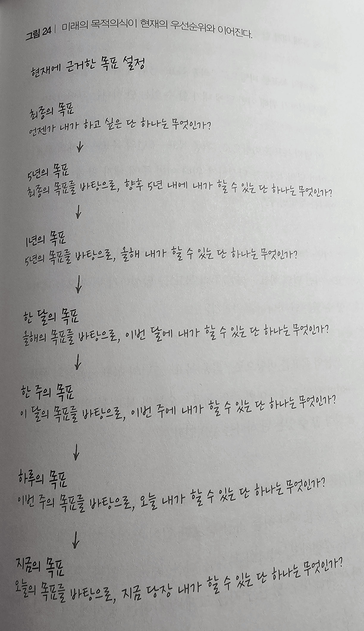 p. 190 ‘현재에 근거한 목표 설정’이라는 필터로 미래의 목표를 정하고, 그것을 체계적으로 정리해 지금 당장 해야 할 일을 만들어본다.
