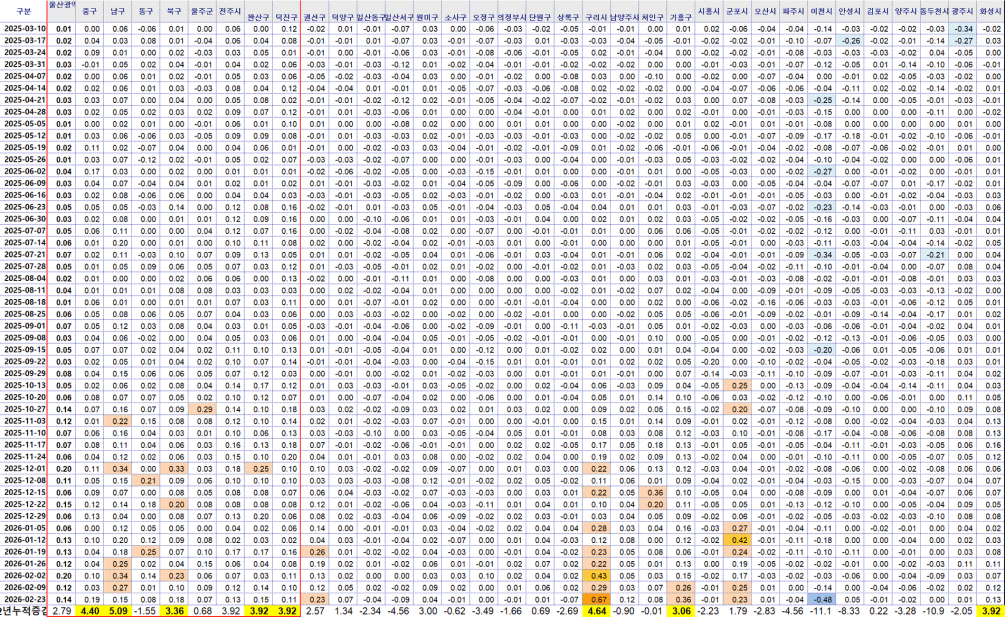 아래 표는 공급이 부족한 대표적인 지역이었던 울산, 전주, 현 시점에 투자가 가능한 수도권내 주요 비규제지역의 최근 1년간 매매 증감률을 보여주는 자료입니다. 맨 아래의 경우는 2년간 증감률을 누적해서 더한 값인데 구리를 제외하고는 오히려 울산과 전주가 더 높은 상승률을 보여줬음을 확인할 수 있습니다.