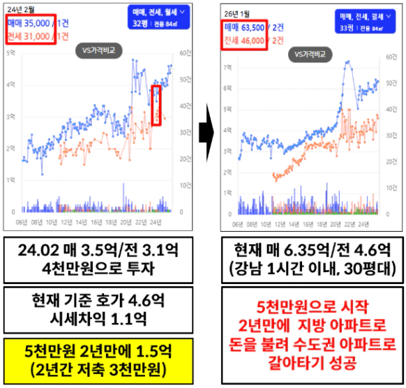 실제 아래 예시는 소액으로 지방 투자를 2년전에 진행했고, 올해 초 수도권에서 강남까지 1시간 이내 접근이 가능한 단지로 갈아탄 사례입니다. 막