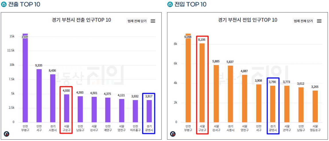 빨간색 네모는 부천과 구로구의 전/출입 인구