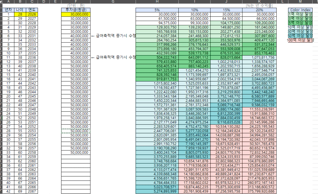 - 수익률 10%: 51세 (2049년)