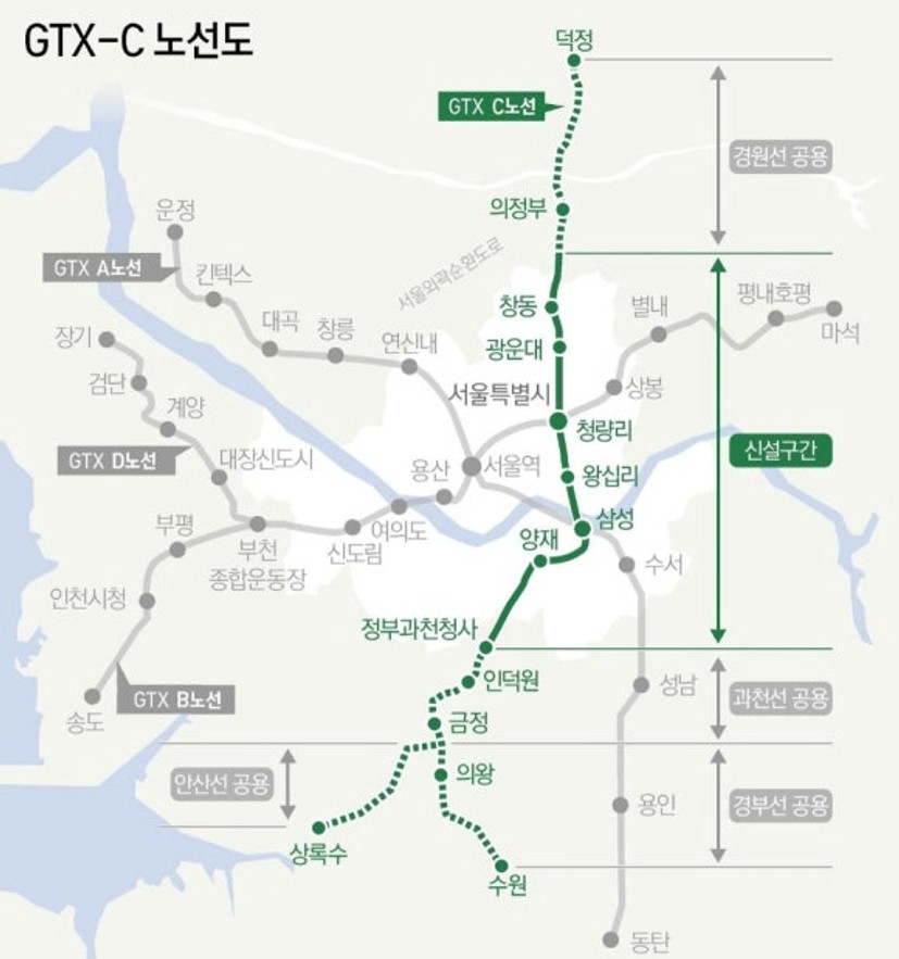 GTX-C 노선은 양주 덕정역과 의정부역을 거쳐 수원·상록수역까지 연결되는 노선으로 삼성역을 지나게 되어 수도권 북부의 교통 혁신을 일으킬 수 있는 노선입니다. 이런 이유로 양주·의정부 부동산 투자 열풍도 있었습니다.