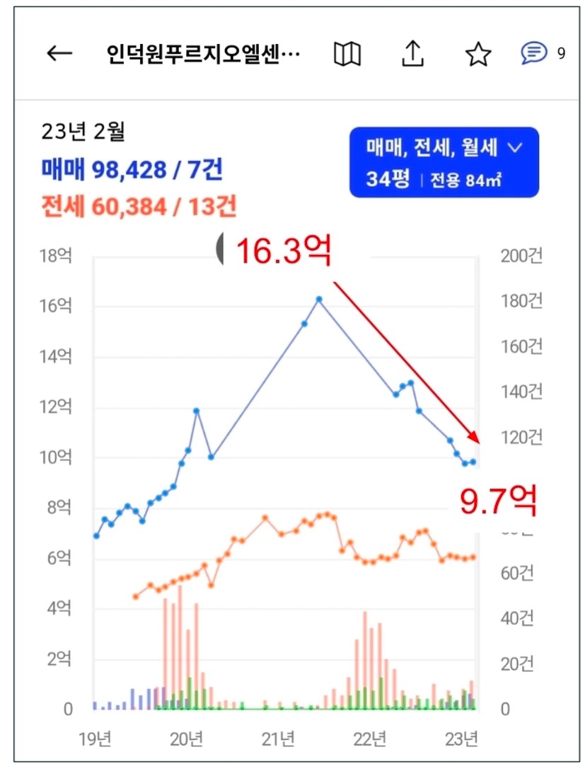 우리는 지난 2022년 하락장에서 인덕원푸르지오엘센트로 사례를 기억해야 합니다. 당시 GTX-C 정차 기대감으로 16.3억 원까지 치솟았던 가격이, 하락장이 오자 호재의 거품은 빠르게 걷혔고 9.7억 원까지 무려 40%가 넘게 폭락했습니다. 불과 1년여 만에 자산 가치가 급격히 무너지는 것을 보며, 호재 하나에만 의존한 투자가 얼마나 위험한지를 보여주는 사례 입니다.