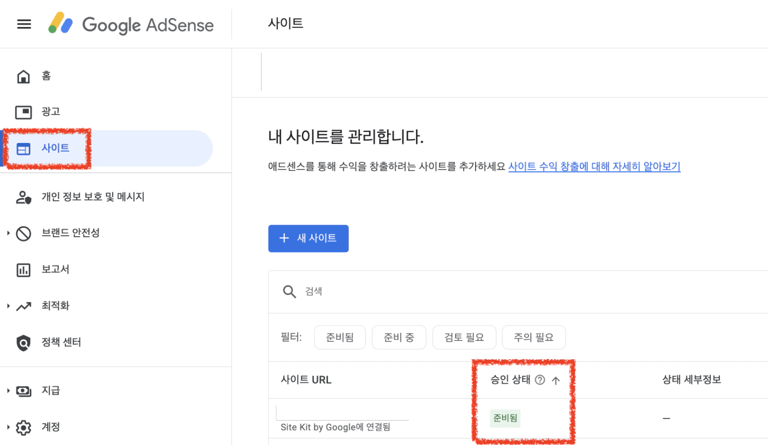 • 애드센스 홈페이지 접속 → 왼쪽 메뉴의 [사이트] 접속 → 사이트 URL 옆 [승인 상태]가 [준비됨]인 상태를 보여주세요.