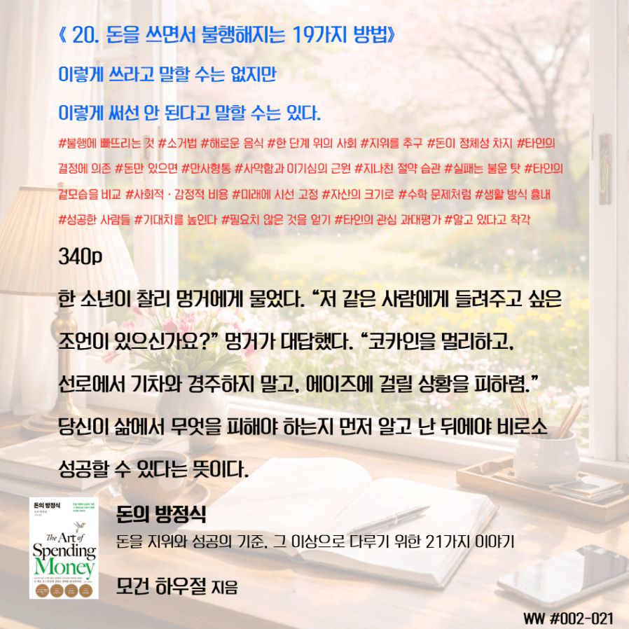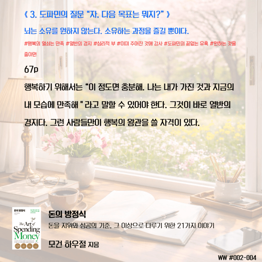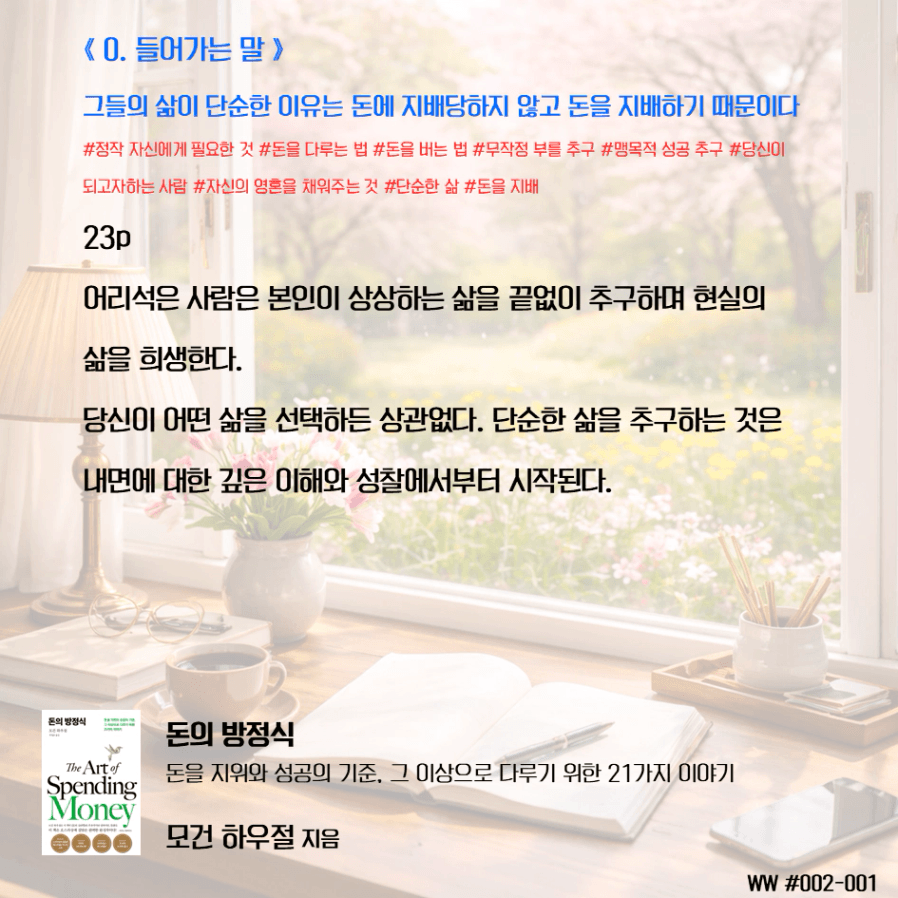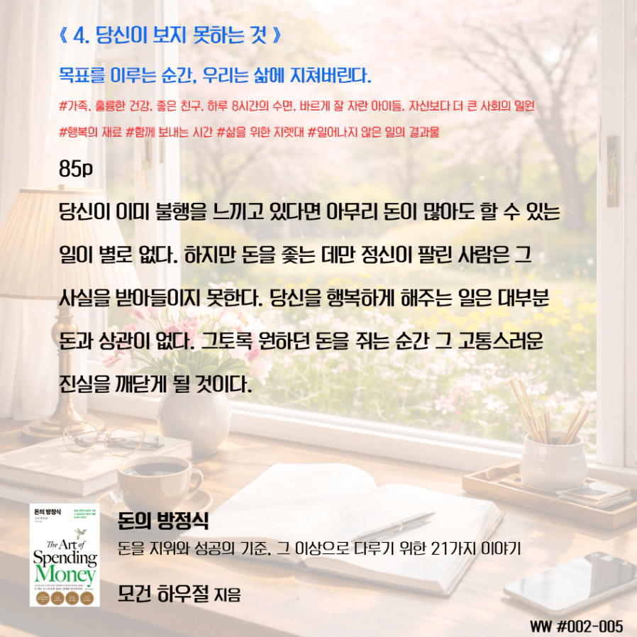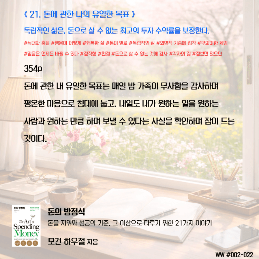 돈이 비교 우위를 두기 위함이 아닌, 돈으로 살 수 없는 가족과의 시간과 추억, 독립적인 삶, 선택의 자유를 선택하기 위한 도구로 돈을 다뤄야 한다. 막연히 돈이 많아 은퇴하면 가족이 행복하겠지 상상하며 삶에서 가족과 멀어졌다. 가족을 위해 공부하니, 가족은 당연히 기다려줘야 한다고 생각했다. 나는 손에 잡히지 않는 행복을 꿈꾸며, 현재의 가족과의 시간을 소비하고 있었다. 그동안 행복의 단서라고 생각했던 좋은 집, 좋은 차, 해외여행이 행복을 보장하지 않는다는 것을 새삼 깨닫게 되었다. 단순한 삶의 의미가 조금씩 이해가 된다.