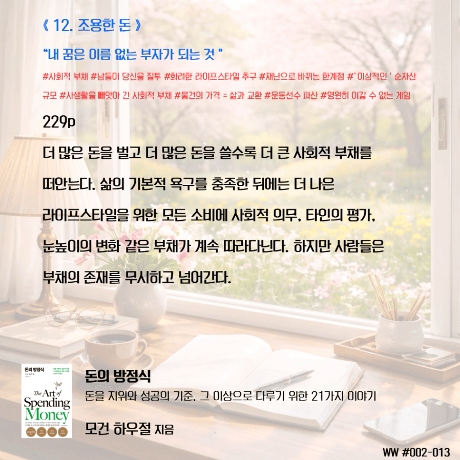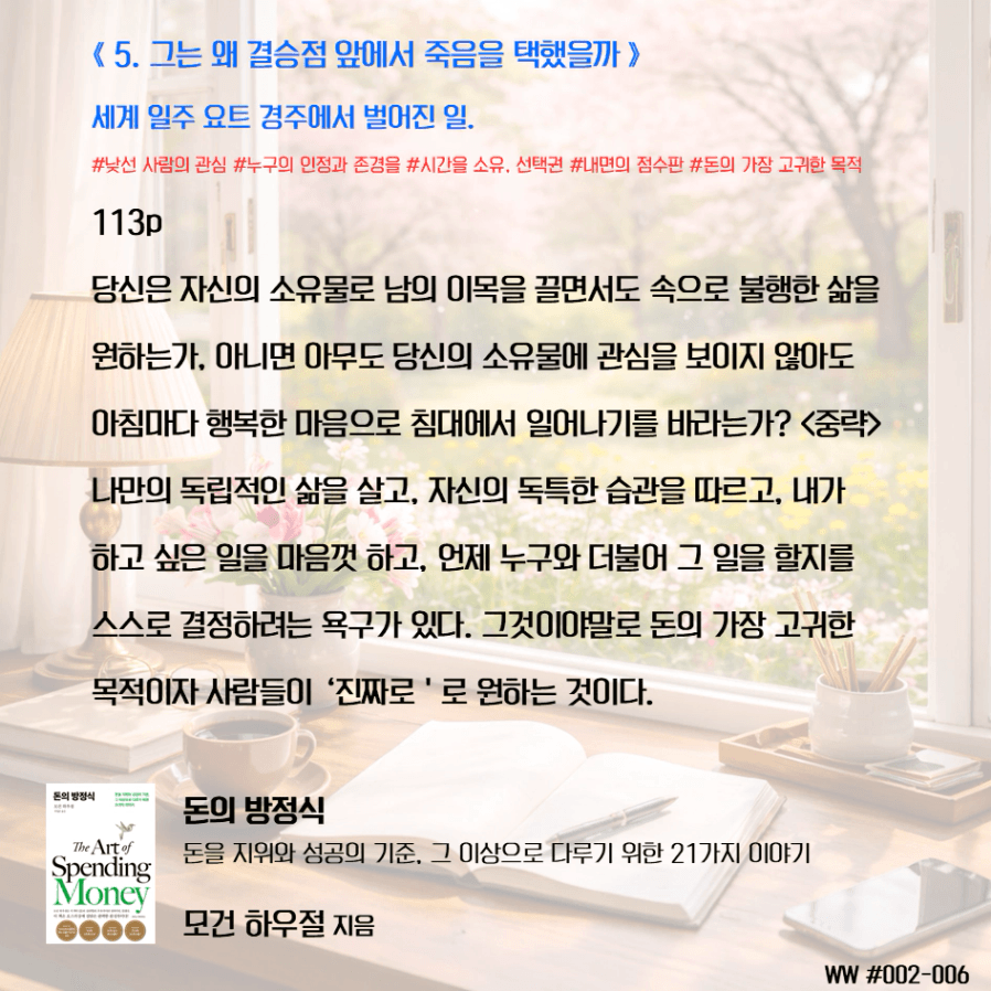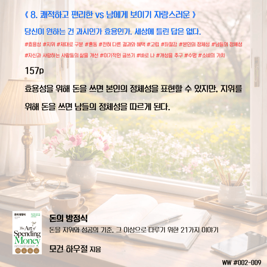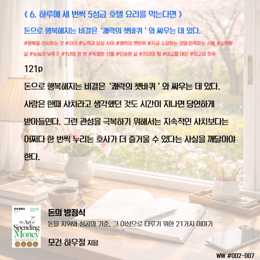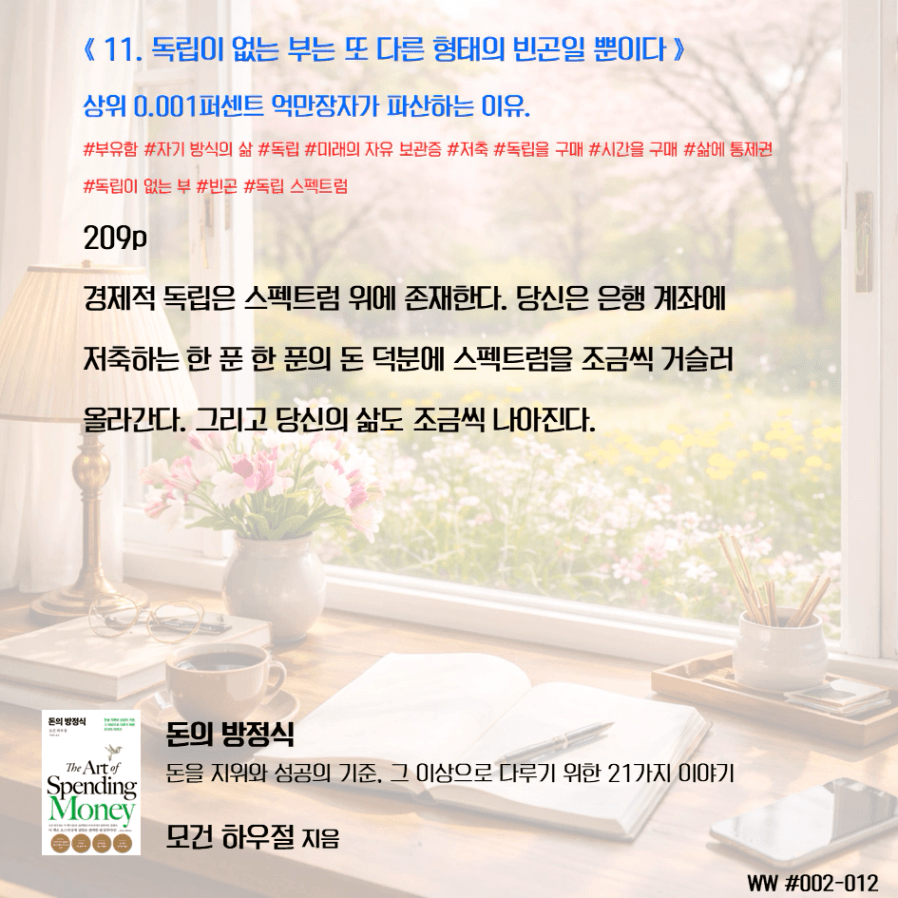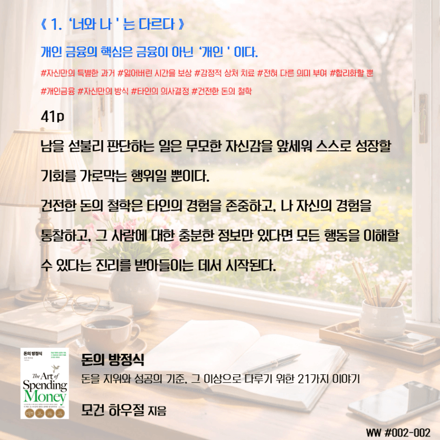 돈이 비교 우위를 두기 위함이 아닌, 돈으로 살 수 없는 가족과의 시간과 추억, 독립적인 삶, 선택의 자유를 선택하기 위한 도구로 돈을 다뤄야 한다. 막연히 돈이 많아 은퇴하면 가족이 행복하겠지 상상하며 삶에서 가족과 멀어졌다. 가족을 위해 공부하니, 가족은 당연히 기다려줘야 한다고 생각했다. 나는 손에 잡히지 않는 행복을 꿈꾸며, 현재의 가족과의 시간을 소비하고 있었다. 그동안 행복의 단서라고 생각했던 좋은 집, 좋은 차, 해외여행이 행복을 보장하지 않는다는 것을 새삼 깨닫게 되었다. 단순한 삶의 의미가 조금씩 이해가 된다.