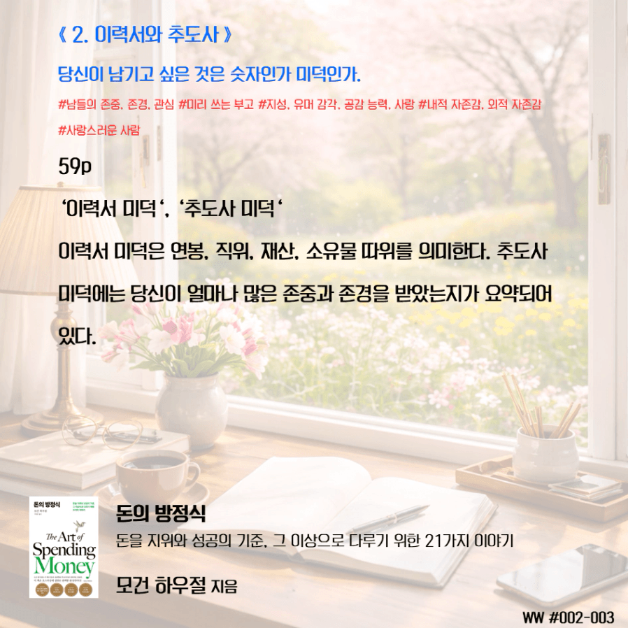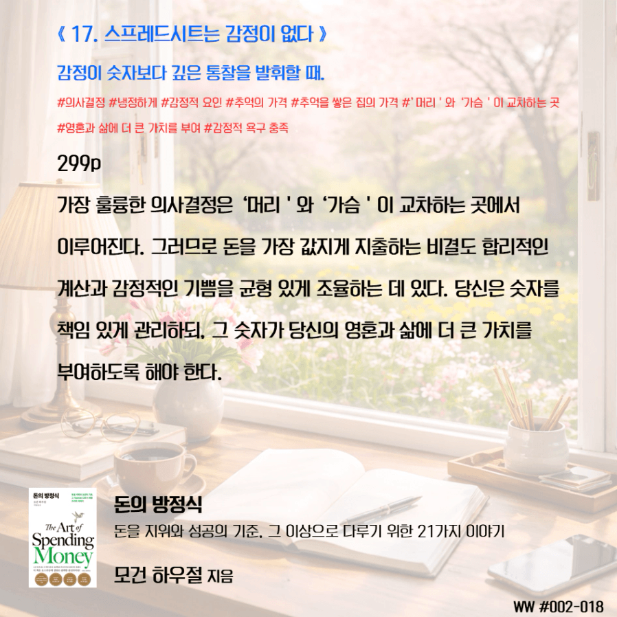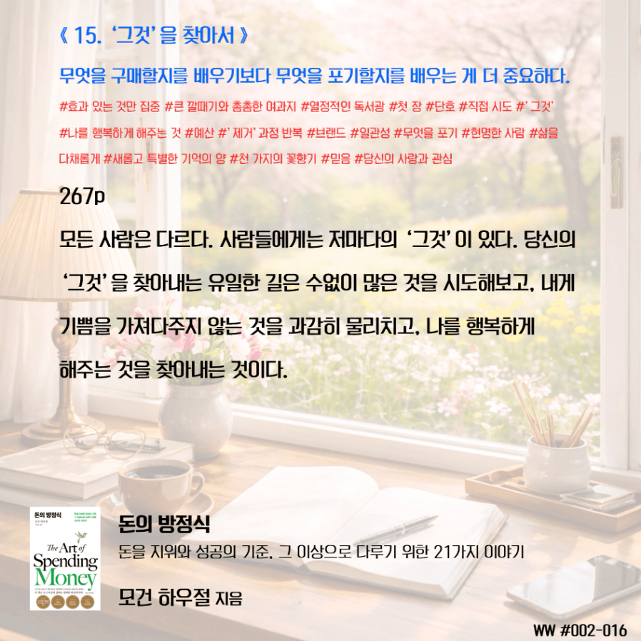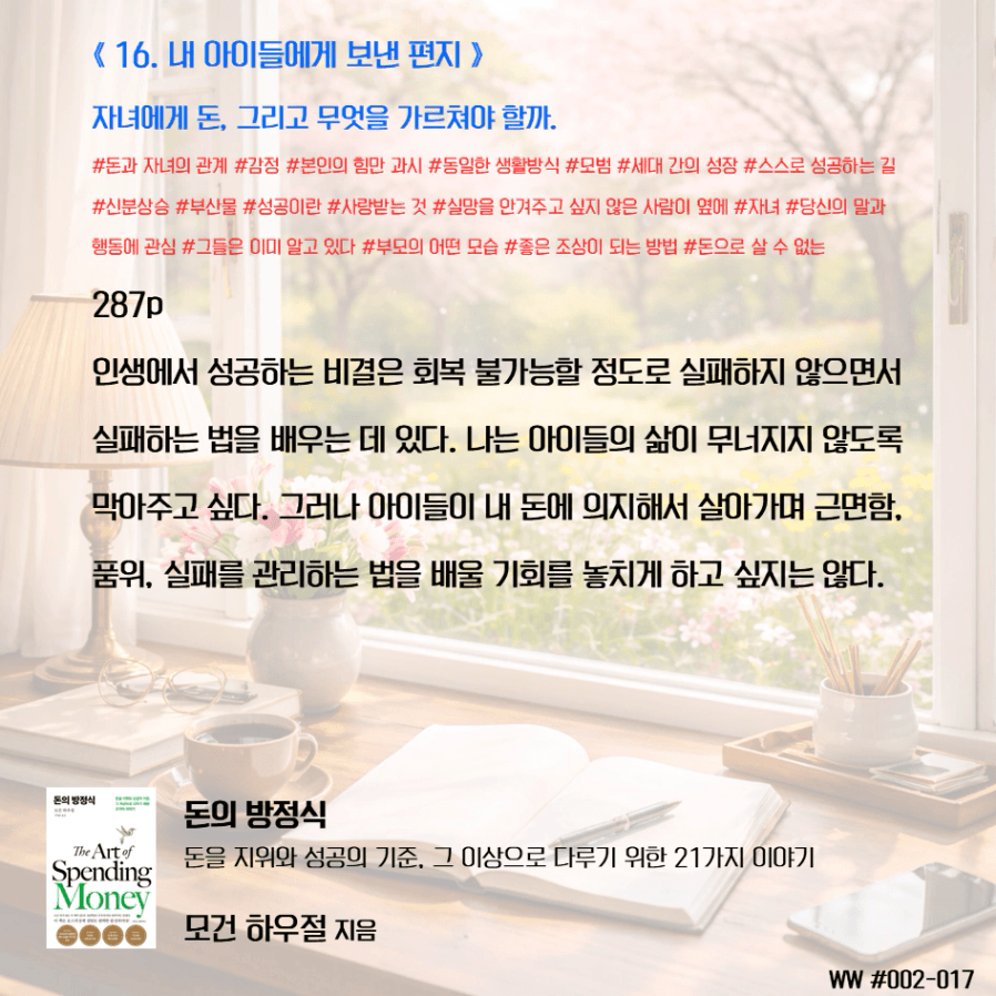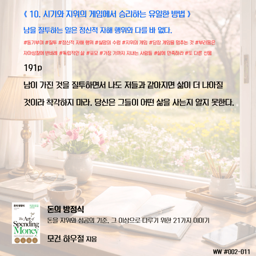 돈이 비교 우위를 두기 위함이 아닌, 돈으로 살 수 없는 가족과의 시간과 추억, 독립적인 삶, 선택의 자유를 선택하기 위한 도구로 돈을 다뤄야 한다. 막연히 돈이 많아 은퇴하면 가족이 행복하겠지 상상하며 삶에서 가족과 멀어졌다. 가족을 위해 공부하니, 가족은 당연히 기다려줘야 한다고 생각했다. 나는 손에 잡히지 않는 행복을 꿈꾸며, 현재의 가족과의 시간을 소비하고 있었다. 그동안 행복의 단서라고 생각했던 좋은 집, 좋은 차, 해외여행이 행복을 보장하지 않는다는 것을 새삼 깨닫게 되었다. 단순한 삶의 의미가 조금씩 이해가 된다.
