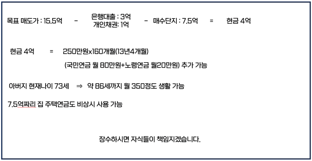 집을 매도하는 것이 맞다는 말씀을 드리면서, 미리 계산해 둔 부모님의 노후를 말씀드렸습니다.