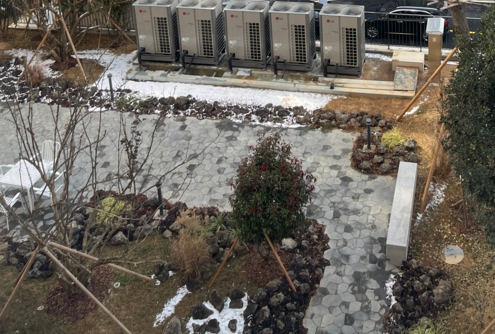 저층세대에 입주를 하게 되었는데 사전점검 때 베란다 밖, 사진과 같은 실외기 5대 때문에 소음이 집까지 들어오는 것을 확인했습니다.(아래 커뮤니티센터 공조시설로 추정)