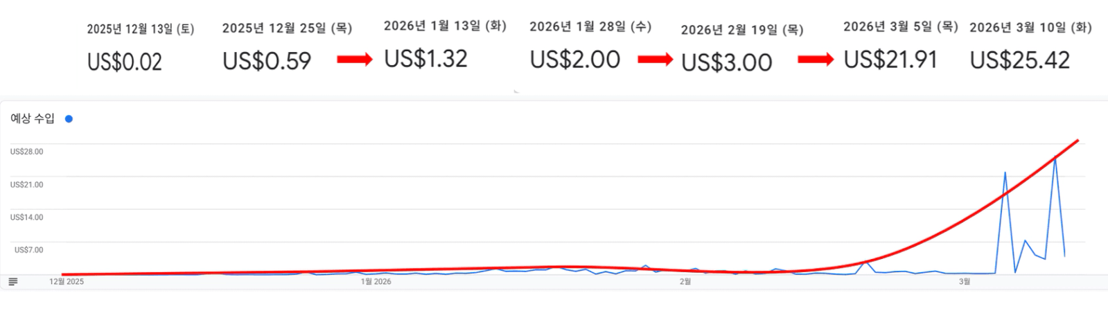 실버님 수익 인증과 더불어 솔직한 후기 감사합니다 ㅎㅎ 12월 13일 0.02달러로 시작해서 3월 10일 25.42달러까지!! 이 페이스면 월100은 금방 넘으시겠네요! 최고예요 👍