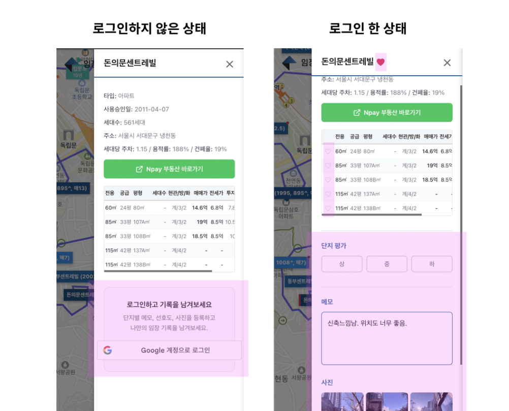 이 과정이 번거롭고 사용하기가 편하지는 않은 것 같아서 임장로그에 이 기능을 특화해서 만들어봤습니다.