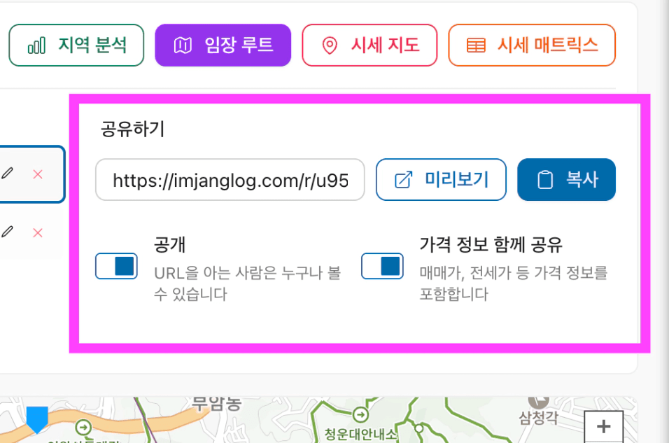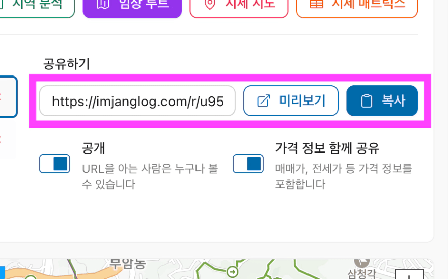여기에서 ‘공개’ 를 클릭해서 공개 상태로 활성화하면 다른 동료들도 이 임장루트 지도에 누구나 접근할 수 있어요.