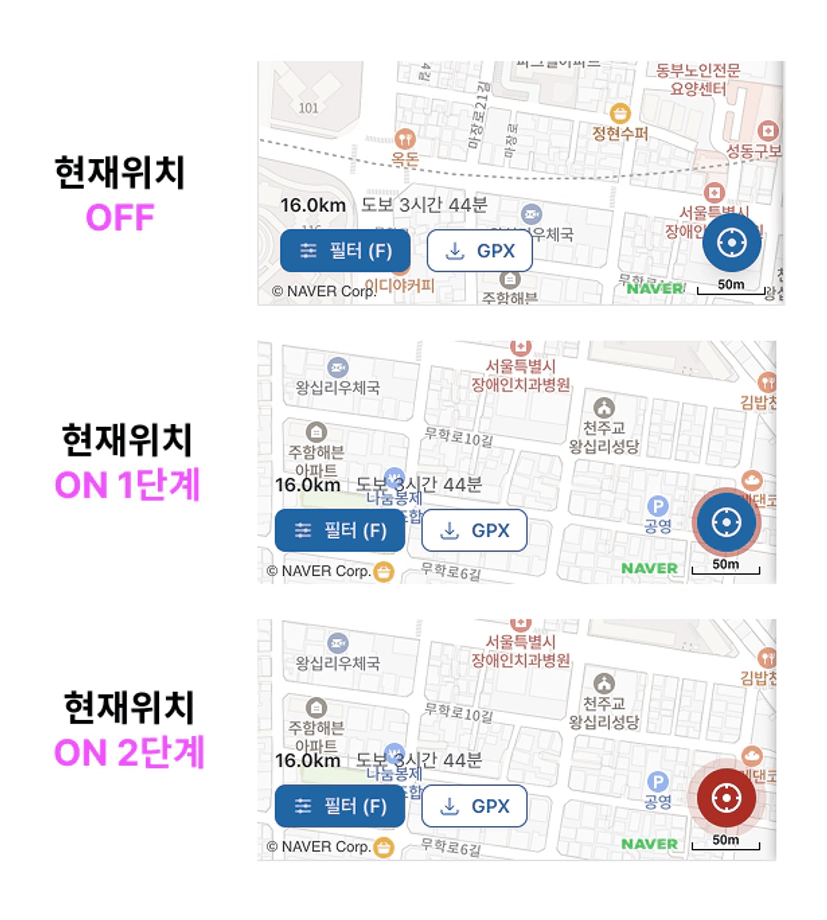 이 상태는 화면 중앙이 내 위치로 고정되고, 움직일때마다 지도가 따라 다녀요.