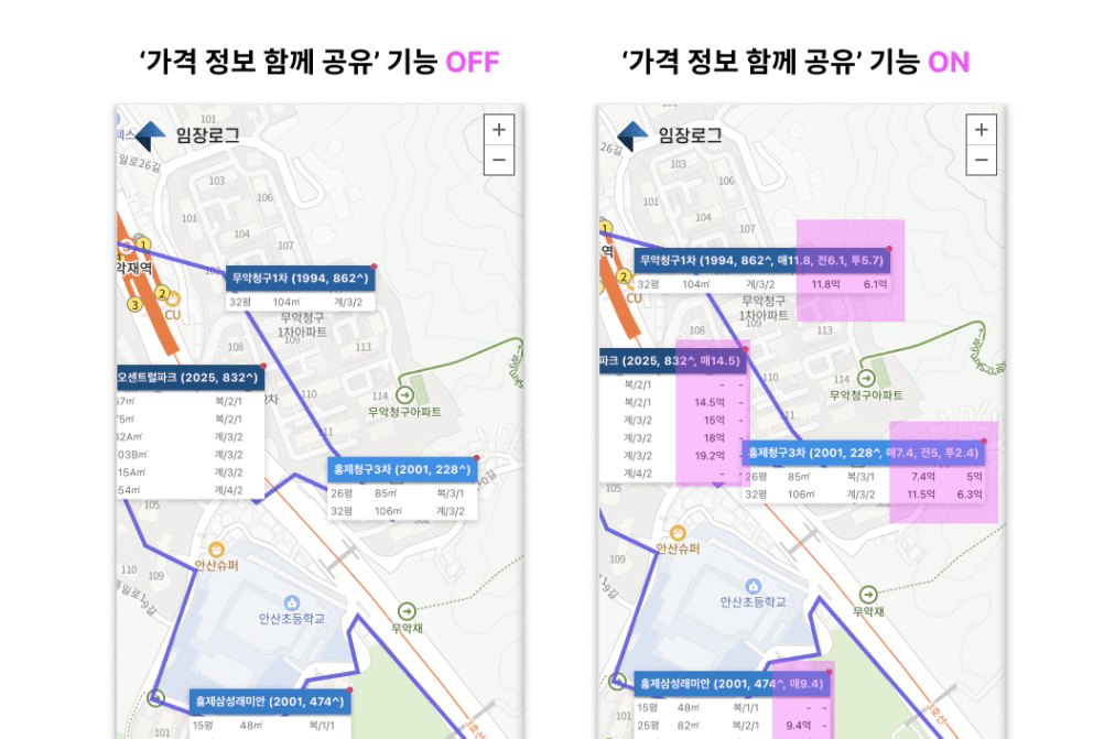 ‘가격 정보 함께 공유’ 기능은 내가 시세를 미리 입력해둔 경우, 지도위에 시세를 같이 볼 수 있도록 표시되는 기능입니다.