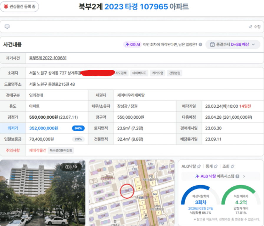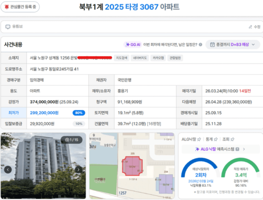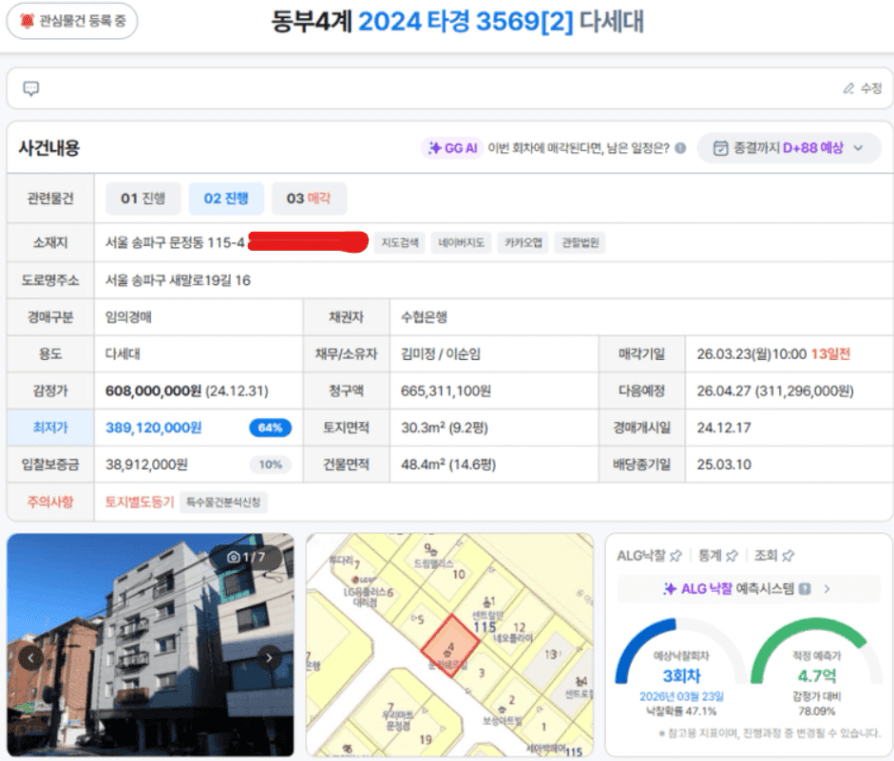 입지와 가격 면에서 확실한 메리트가 있는 물건입니다. 다만 임차인의 배당 상황을 고려하여 명도 협상을 미리 염두에 두고 접근하는 것이 좋겠더라고요.