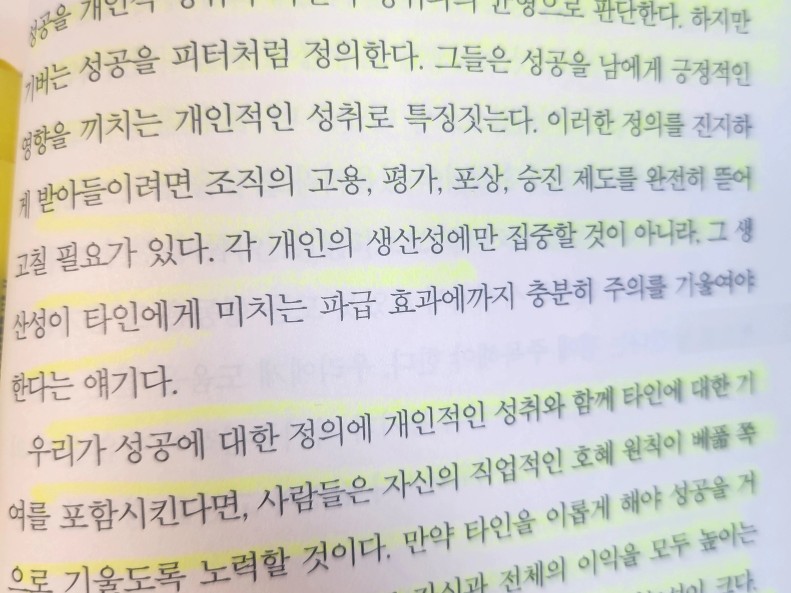 : 기버의 머릿속에는 성공 자체가 다른 정의로 자리 잡는다. 테이커는 성공을 남들보다 더 나운 결과를 얻는 것이라고 본다. 매처는 성공을 개인적 성취와 타인의 성취와의 균형으로 판단한다. 하지만 기버는 성공을 남에게 긍정적인 영향을 끼치는 대인적인 성취로 특정짓는다. 성공을 걱 개인의 생산성에만 집중할것이 아니라 그생산성이 타인에게 미치는 파급에까지 주의를 기울여야 한다. 우리가 성공에 대한 정의에 개인적인 성취와 함께 타인에 대한 기여를 포함시킨다면 사람들은 자신의 직업적인 호혜원칙이 베품 쪽으로 기울도록 노력할 것이다. 우리가 깨어 있는시간의 대부분을 직장에서 보낸다. 이는 직장에서의 행동이 우리가 어떤 사람인가를 결정하는 중요한 부분이하는 것을 의미한다. 만약 당신이 일생생활에서 기버의 가치를 간직하고 한다면 직장생활에서 무엇을 놓치고 있는가? 조금이라도 이타적인 방향으로 전환하면 우리가 깨어있는 시간은 더욱더 큰성공 , 풍부한 의미 그리고 지속적인 영향력으로 가득 채워질 것이다.