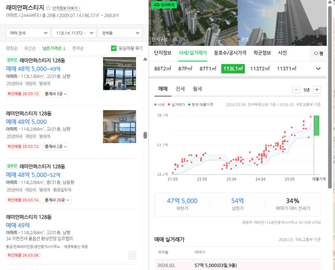 최근 강남의 상징과도 같은 반포 래미안퍼스티지가 '23년 초 약 30억 수준에서 60억까지 가격이 올랐습니다. 실제로 직전 달인 2월에 실거래가는 57.5억까지 오른 상황으로 사실상 2배가 올랐습니다. 그러나 그 이후 양도세 중과 유예 종료가 5/9로 확정이 되자 급하게 매도하는 분들이 나오기 시작했습니다.