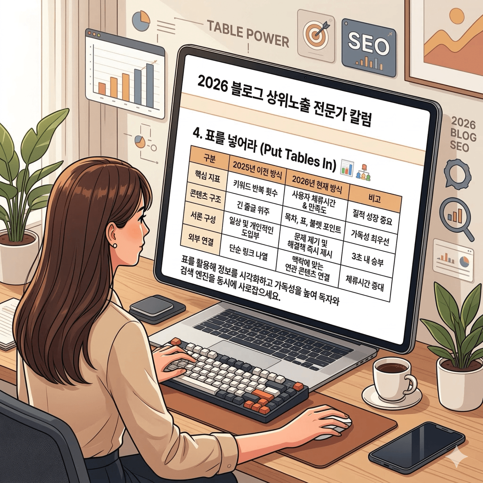 텍스트로만 이루어진 글은 지루함을 줍니다. 핵심 정보를 표로 정리하면 독자는 한눈에 내용을 파악할 수 있고, 이는 자연스럽게 높은 만족도와 체류시간으로 이어집니다.