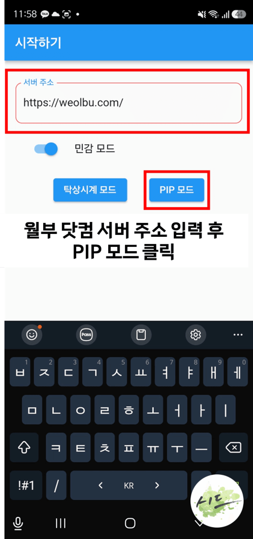 민감모드 선택, 입력 후 PIP 모드 클릭