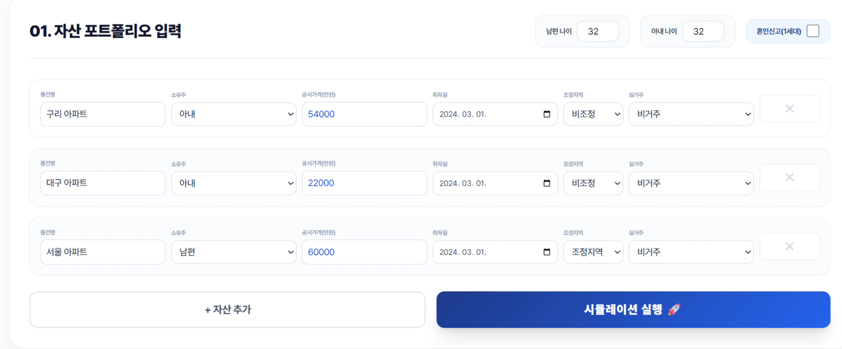 현재 보유하고 있는 자산의 공시가격과 명의, 조정지역 여부, 거주형태