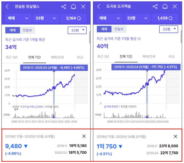 다주택자의 물건이 급매로 나오지 않을까하는 심리가 있었고 일부 단지에서는 하락 거래가 있기도 했습니다. 일반적으로 상급지일수록 정책 변화에 민감한 편이데요. 강남구, 송파구의 선호 단지에서 기존 실거래 1억 넘게 낮은 가격으로 거래가 되기도 했습니다.
