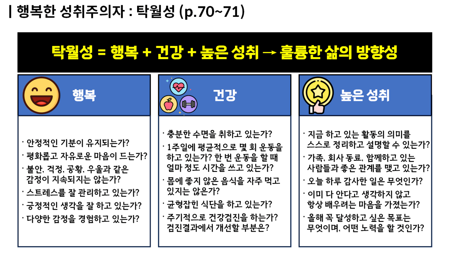 탁월성 등식을 떠올리며 행복, 건강, 높은 성취 3가지의 관점을 항상 유지하는 걸 적용해보겠습니다.