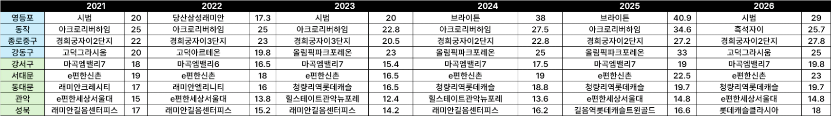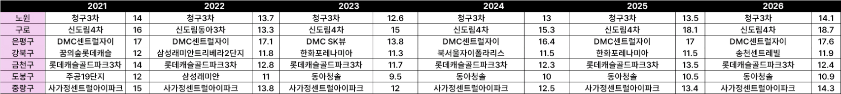 • 동대문구의 도약: 2024년까지 17억 선이었으나 2025년 23.3억으로 폭등했습니다. 이는 청량리 일대의 대규모 신축 주상복합 입주와 정비사업이 지역 전체의 가격 천장을 밀어 올렸기 때문입니다.