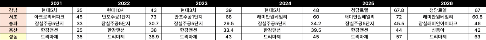 • 송파(잠실주공5단지→ 잠실래미안아이파크): 2021년 33억에서 2026년 46억으로 꾸준히 올랐으나, 강남·성동의 60억대 진입과는 격차가 벌어지고있습니다.