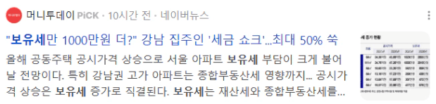 최근 공시가격 상승으로 보유세가 증가했다는 기사 내용이 보입니다.