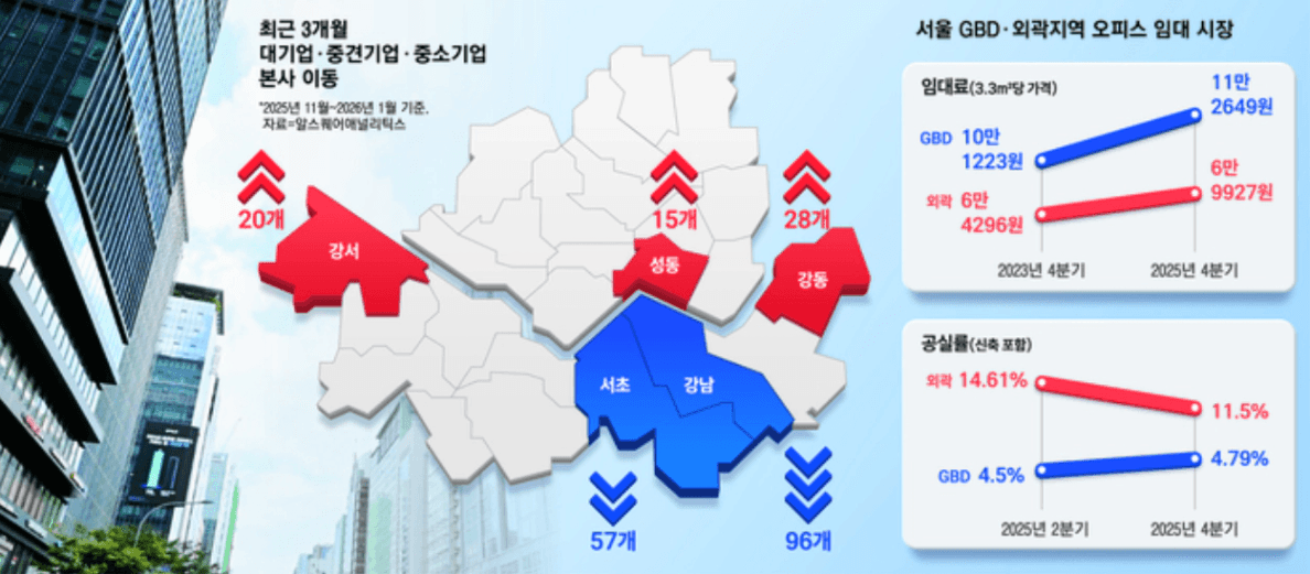 실제로 최근 3개월간 기업 본사가 이동한 지역 7곳 중 6곳이 서울 외곽(강동, 강서, 금천 등)입니다.