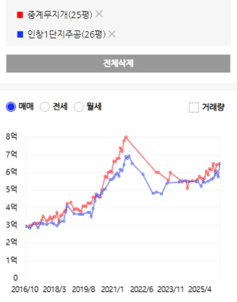 실제로 가격흐름을 확인했을 때, 노원구 중계무지개가 구리 인창주공보다 먼저 흐름을 받는걸 알 수 있습니다