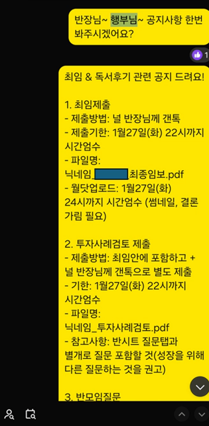 그리고 스스로 자신감이 부족하고 운영진이 해야할 것들에 서투르다르는 것을 인정하고 적극적으로 반장님과 부반장님께 작은 것 하나라도 확인을 요청 받고 진행했습니다.