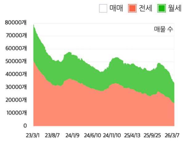 서울 평균 전월세는 꾸준히 오르고 있고, 전월세 매물량 자체가 급감하고 있습니다.