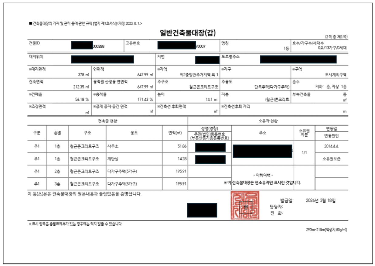 ➡️ 임대 전 건축물대장에서 용도, 층별 면적, 세대수, 위반건축물 표시 여부 확인하고