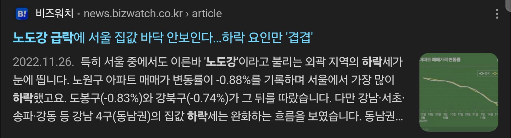 하락폭은 금액이 높은 강남지역이 높았지만 하락비율은 외곽지역이 비교적 높았고
