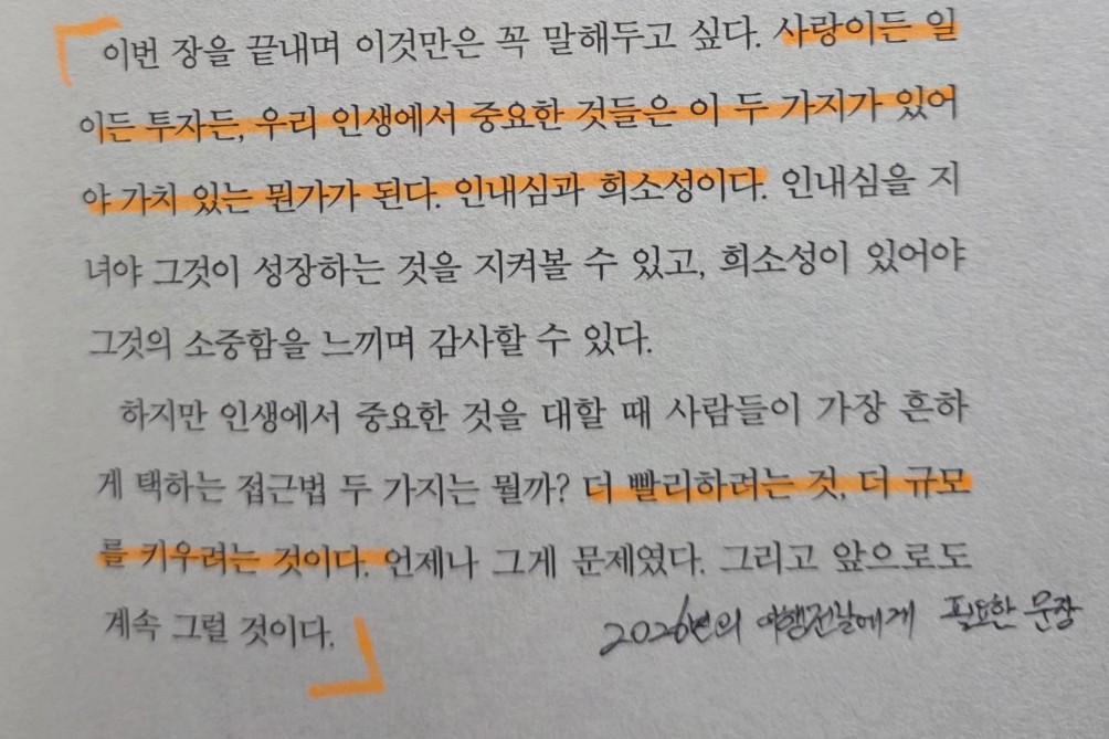 "큰수익을 내는 것보다 재정적 파산을 겪지 않고 버티는 힘을 키우는 것이 더 중요하다. 그 힘을 키우면 가장 큰 수익을 얻게 된다. 복리 효과가 기적을 일이킬 만큼 오랫동안 살아남을 수 있을 것이기 때문이다.'