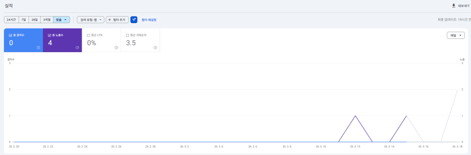 그런데, 서치콘솔에서 총 노출수가 4개밖에 되지 않고 3월 10일까지 아예 노출 수가 0건으로 잡히는데,