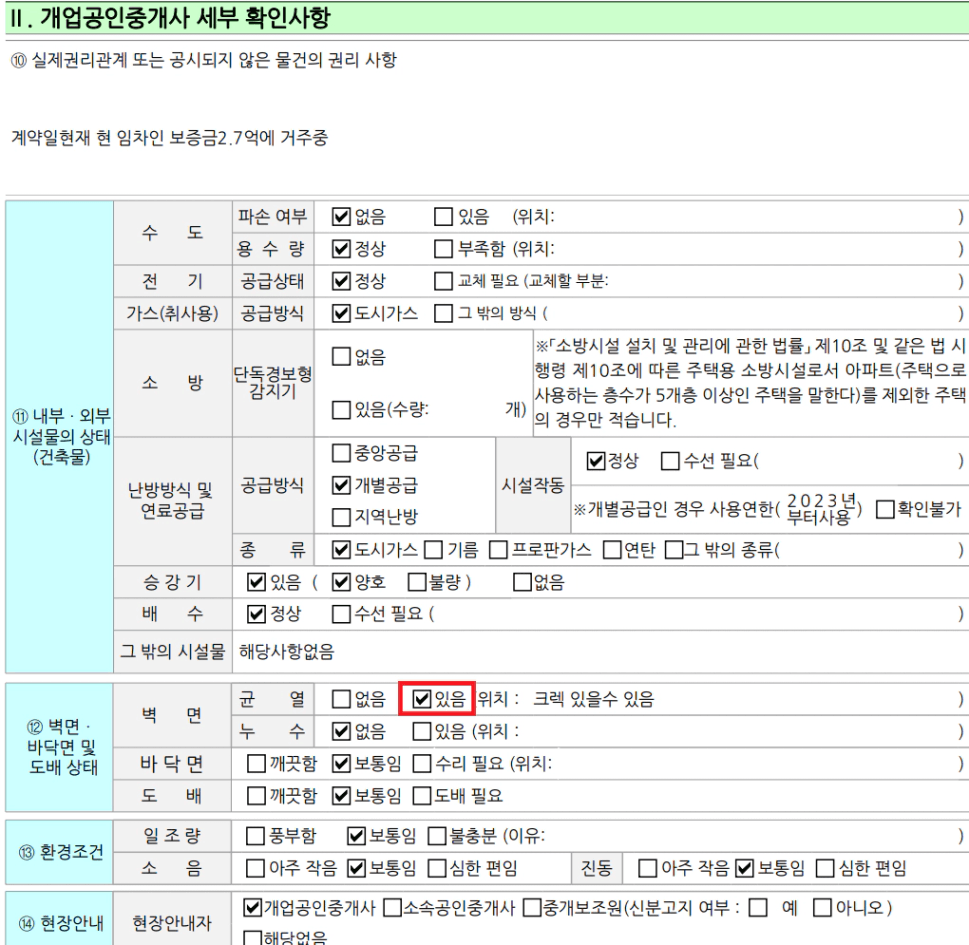 안방 화장실 옆 벽면에 균열이 있는데, 이것 때문에 위 12번이 "있음"으로 체크된 것 같은데 문제 없을까요..?