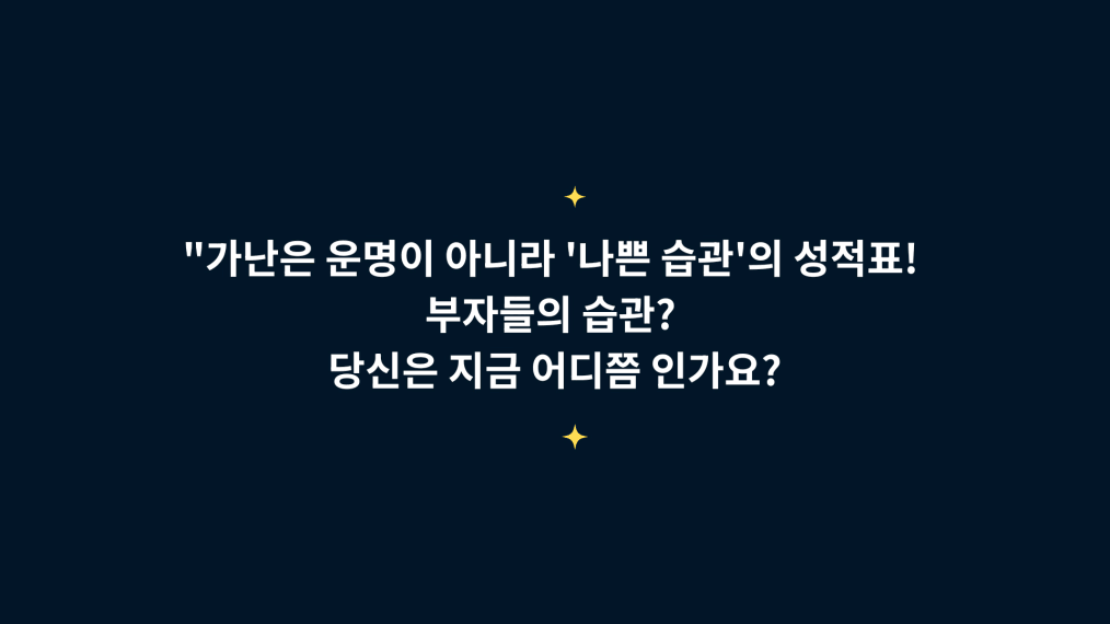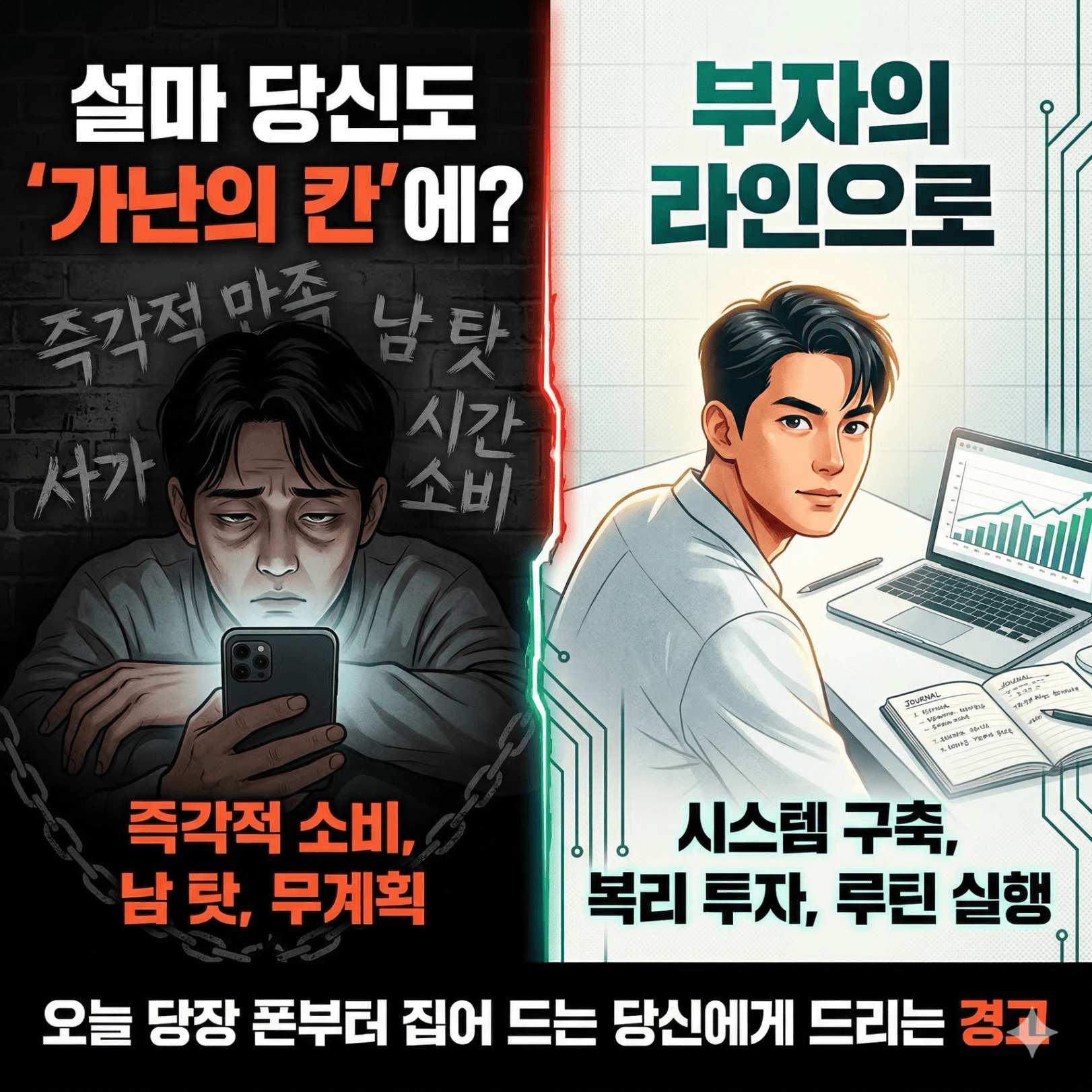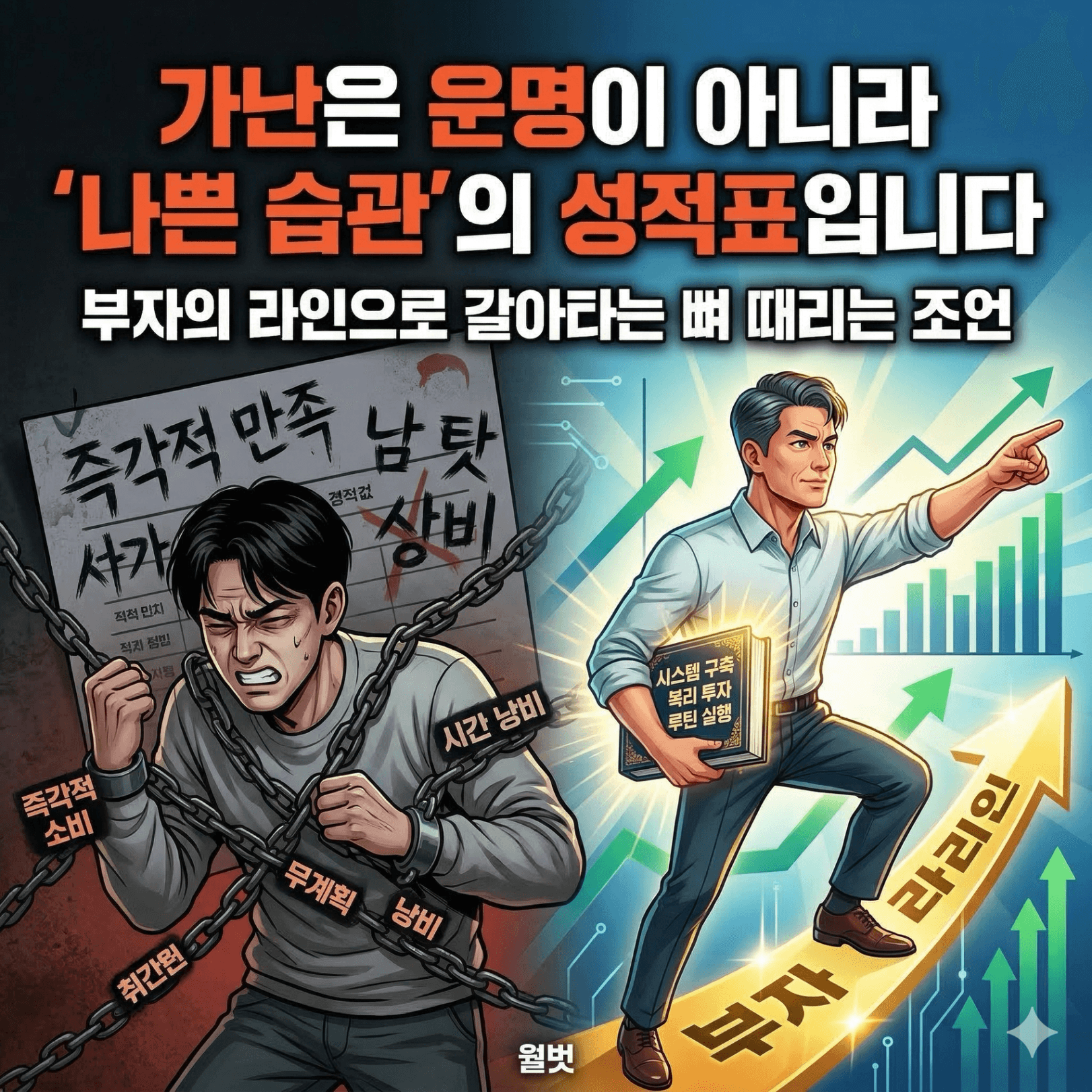 "가난은 선택이 아니라 습관이다"라는 말은, 당신이 가난을 '선택'한 것은 아니지만, 매일 무의식적으로 반복하는 행동들이 당신을 가난의 올가미에 붙들어 매고 있다는 뜻입니다.