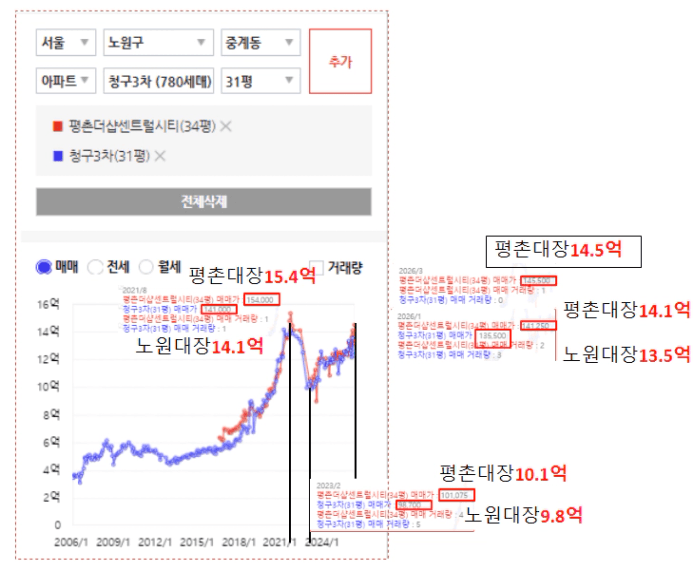 평촌은 21년 전고점을 15.4억까지 찍었고.. 노원은 21년 14.1억을 찍었다.