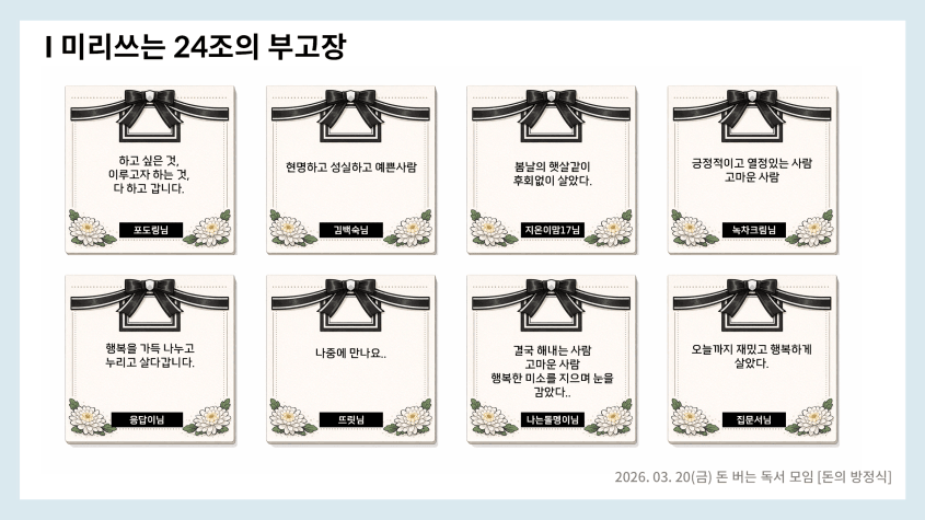 독서모임 시간을 이용해서 부고장에 들어갈 한 줄을 생각해봤다.