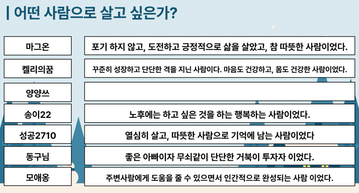 타인의 시선을 신경쓰고 타인과의 비교를 하는 것들이 나만 그런 것이 아니구나 하는 마음에 한편으로는 안도감이 들었던 것 같습니다. 하지만 그런 것 없이 정말 단단하고 큰 그릇을 보여주신 조원분도 계셨는데요. 정말 내가 진정으로 원하는 것이 무엇인지를 잘 생각해보고 그에 걸맞는 사람이 되고 싶다는 생각을 했던 것 같습니다.